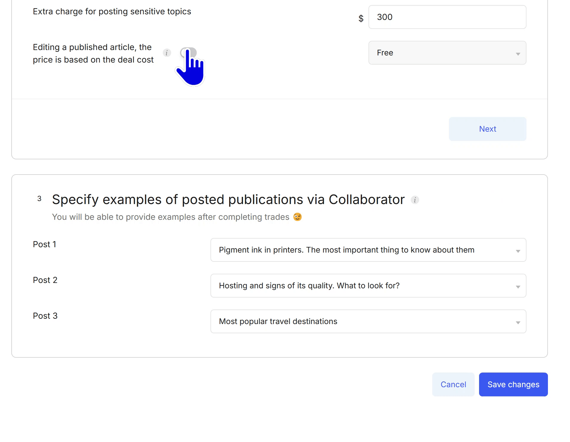 A gif illustrating how to set up a price for editing of published articles.